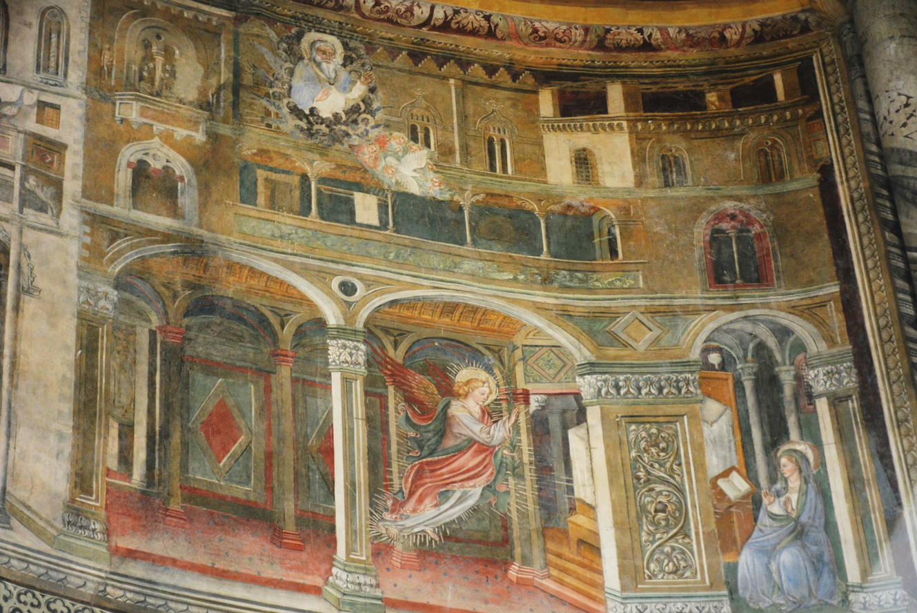 Ebben az egykor falakon kívüli templomban több, különböző korokból származó angyali-üdvözlet jelenetet szemlélhetünk. A legszebb egy hatalmas, látványos freskó a szentélyben, valamikor a XV. században keletkezett. A sorozat Mária életét mutatja be, az angyali üdvözlet alatt a kis Mária születésének jelenetét látjuk.